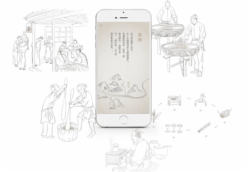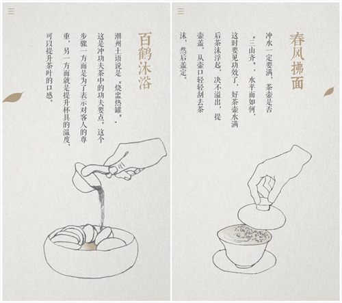 在「泡」、「品」、「史」中则分别以画卷的形式展现了潮汕功夫茶的冲泡方法、品鉴方式,以及简单的历史小科普,简单文字辅以中国风的简笔画,再加上从右向左的横轴式浏览都使得「食茶」的科普别具一格。