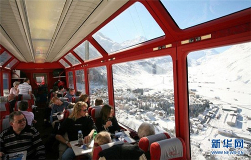 在瑞士的冰川快车上,乘客在全景车厢欣赏阿尔卑斯山的美景。(网页截图)
