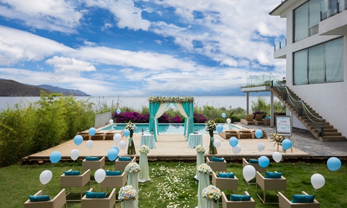 【蓝天白云之下,草地之上,远观湖景,近看泳池,这是天然的场景优势,再配以一场简单而美的小众婚礼布置,多少让人有点想要置身其中。】