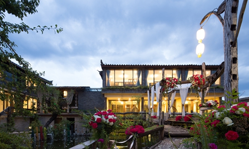 【丽江传统的木质院落,花前月下,每走过一道搭着白色帷幔的木桥,都仿佛奔向洞房。】