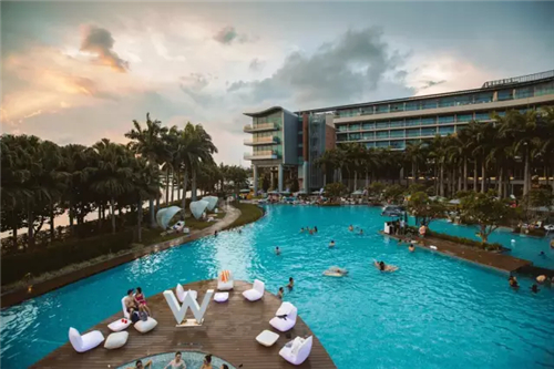 位于圣淘沙岛的The W Singapore酒店有一个室外泳池,泳池里有水下播放器,你在游泳的时候也能享受音乐。