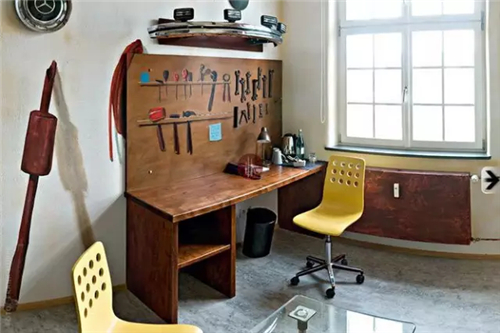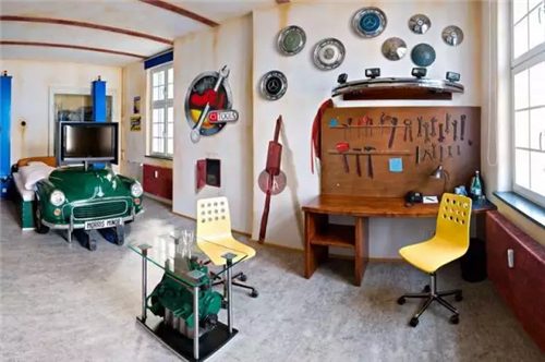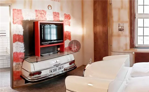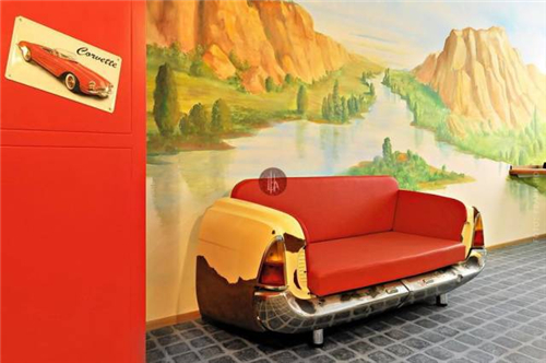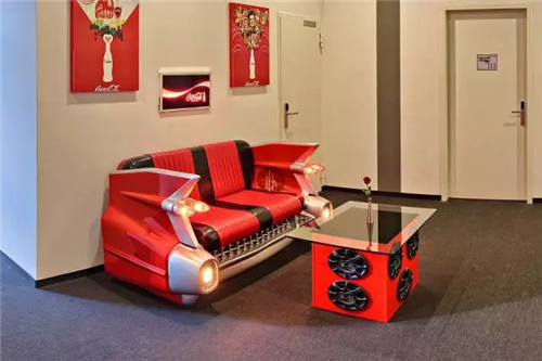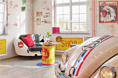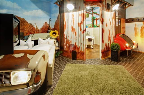 好玩的还有“废车回收场”主题房,房间内的家具多由废旧汽车上的零部件制成。