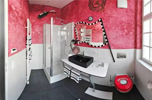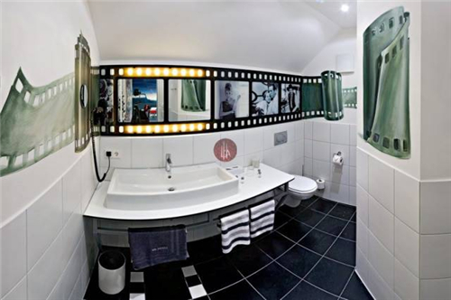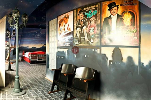 客房墙上布满了电影海报,洗手间也设计成了电影胶卷,墙上的平板电视充当了电影屏幕……这里就是一间十足的汽车影院。