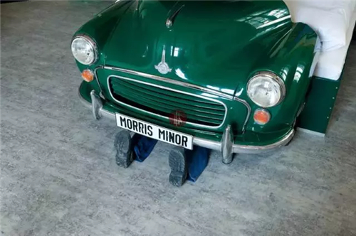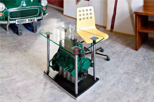 各种零部件,各种把手,实物引擎设计成的桌子,睡床也是由货真价实的一辆莫里斯老爷车设计而成的。