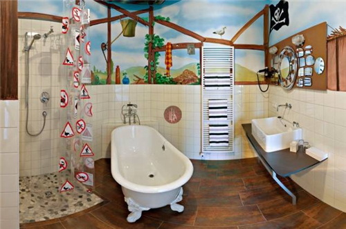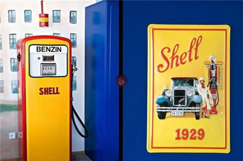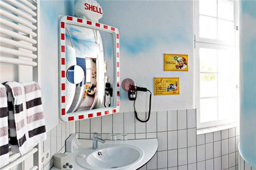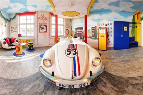 色彩鲜艳明亮,各种加油站设施装饰其中,汽油泵、闪烁的霓虹灯,经典的壳牌招贴画……让人心生喜爱的还有金龟车贺比打造而成的睡床。