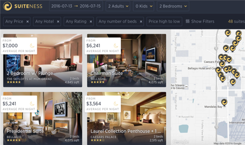 这家成立于 2014年的网站,目前的业务范围覆盖了美国拉斯维加斯,纽约,洛杉矶,迈阿密等多个城市,并很快将会拓展到旧金山。通过 Suiteness 的线上平台,客户可以预订来自不同酒店超过一万间套房,从比标准酒店客房略大的普通套房,到每晚租金上万的顶级套房,可选种类十分丰富。
