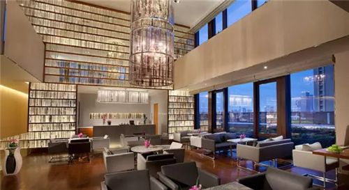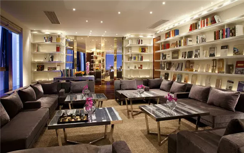走进大厅,迎面可见印满书籍的装饰及木制墙面,这些“印象”书籍都是西方现代艺术、摄影、时尚先锋的著作,包括David Bailey、Victor Vasarely、Lukas Felzmann等的作品,彰显着雅诗阁对生活品质的标准与追求。凹凸墙面的设计灵感则源于宋代苏州的城市地图——平江密码。