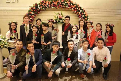 第二天,发布会现场,鲜花盛开,锦缎密布,每一个与会者都成了婚宴宾客,一进现场就会收到一份装着鲜花和巧克力的伴手礼。而一对新人,就是投资人和品牌创始人,签约仪式变成了新人的结合。甚至品牌创始人的吻,也被设计成了拍卖环节,创意十足。