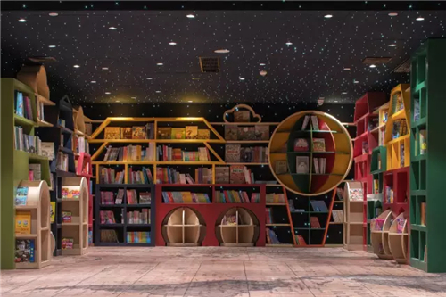 在这间书房的正对面就是儿童绘本馆,为了能够体现孩子天真烂漫的天性,钟书阁把书架做成了可拆解移动的玩具形式。墙上的书架底部部分都可以自由从墙上分离出来并同时兼顾摆书台的功能,当需要场地活动时,它们又可以移回墙面归位到书架里,合成一个城市的街景图案,并融入了扬州的街景文化,通过五彩缤纷的颜色来活跃整个空间。儿童一旦进入这个空间,就像来到了一个卡通版的扬州城市一般。从童书馆的一个拐角探出,就会到达一个小巧精致的玩具馆,整齐陈列着成人与儿童的各种学习用具。