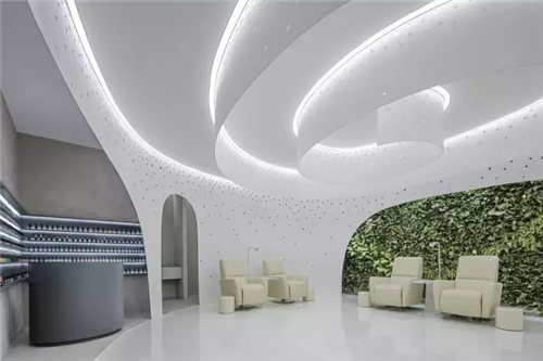 设计摒弃了以往该类型店铺所采用的过度装饰的符号化做法,以营造轻松、舒适、自然的环境体验作为出发点,让顾客们在这里可以放松身心,仿佛置身于一座花园。一圈儿8毫米厚的白色穿孔钢板从商场走廊逐渐延伸至店铺内部,创造出一个柔软、纯净的弧型空间。