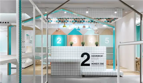 在空间分区上,除了成组团的多系列服装区和饰品区,RIGI策略性地开辟了会员区和儿童体验区。RIGI为kidsmoment专门设计了一系列的道具。以一种介乎于成人和儿童之间的尺度,用丰富的、模块化的不同道具,搭建出高低错落同时又满足组团分区逻辑的陈列空间。让道具本身成为空间搭建的一部分。同时在儿童的高度将过于硬朗的道具台面做了导圆角的处理。