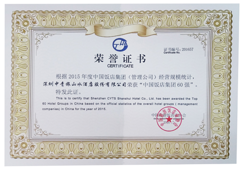 2016年7月20日,由中国旅游饭店业协会主办的“第十三届中国饭店集团化发展论坛”在江苏昆山召开。论坛同期发布了“2015年度中国饭店集团60强”名单并授牌表彰,作为国内中档连锁酒店的领导品牌,中青旅山水酒店成功入围并获得了“2015年度中国饭店集团60强”荣誉。