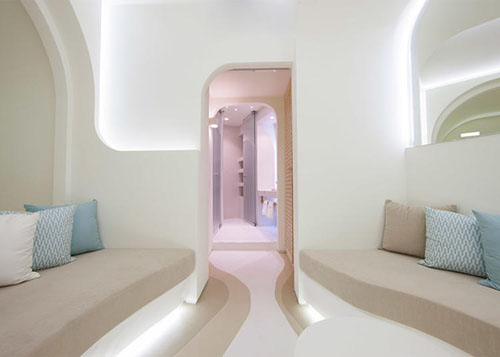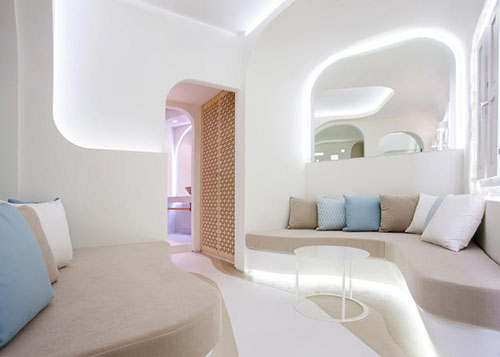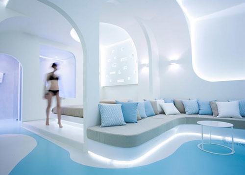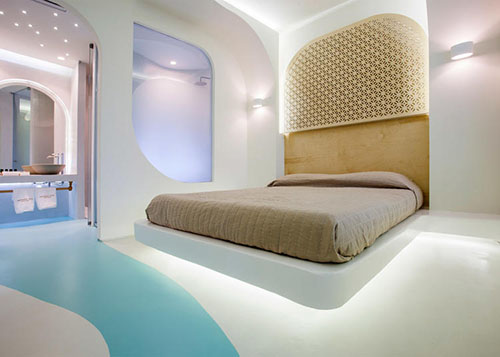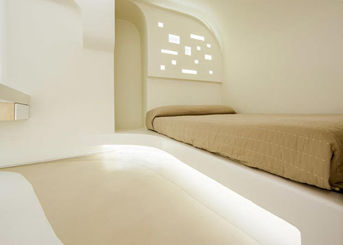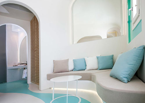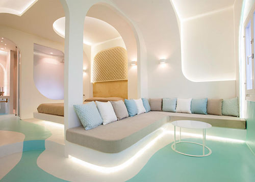 4 层旅馆中只有 6 个套间,有一种爱琴海小房子所没有的未来感。将混凝土地板和墙面打上蜡,涂上浅蓝、浅绿等颜色。