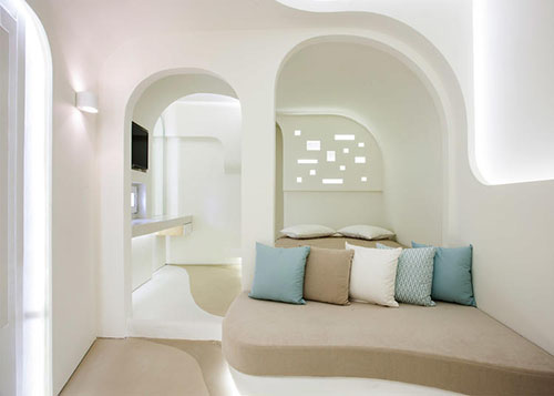 这些白色的小房子很多都发展成家庭式的度假旅馆,据 TripAdvisor 显示,几乎全部都在 1000 元一晚以上。这家 Andronikos hotel 最近完成了改建和重新设计,房间里没有一处直角,圆弧形的门和窗连接了不同的房间,就像是住在洞穴里。