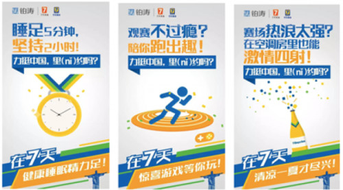 里约奥运会开幕式前1天,7天酒店推出了“力挺中国队,里约吗”系列海报,并在双微平台同步发力,推出了“里约体”造句活动。活动参与者只需用一句话力挺中国队,即可赢取7天好礼,以“__________,里(ni)约吗”为固定句式创作内容,题材不限,风格不限,类型不限。该活动一出,立刻引发大量粉丝疯狂围观、积极参与,短时间内收到了良好反响。