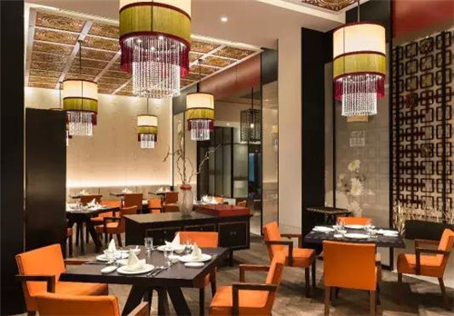在开封铂尔曼酒店的灯光设计中,这种源自古宋、融贯东西的美学理念得到了高度体现,室内灯饰大多采用黑色铁艺灯体与纯色羊皮纸面罩的组合,只在餐厅等少部分公共区域使用水晶灯,并将其笼罩于红黄搭配的“华盖”之下。