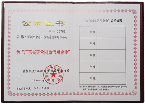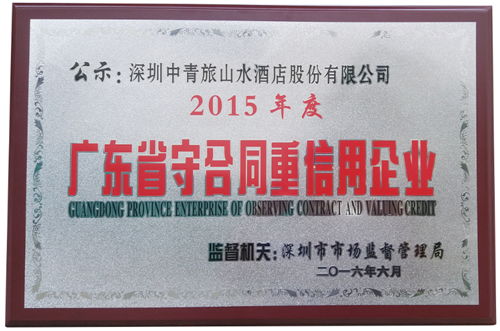 2016年9月,深圳中青旅山水酒店股份有限公司(以下简称“山水酒店”)被深圳市市场监督管理局授予“2015年度广东省守合同重信用企业”奖牌及证书。