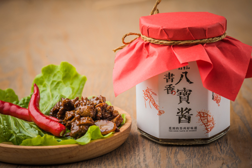 八宝酱由书香酒店集团中央厨房精选瑶柱、虾米、鸡肉、猪肉、花生米、香菇、笋、香干、甜面酱、辣酱、番茄酱等原料加工烹饪而成。属书香心意“寿”系列美食。加工过程中不添加任何防腐剂、添加剂,营养丰富,鲜咸可口,既可作为主餐伴侣,也可以作为饭后茶余的休闲美食。