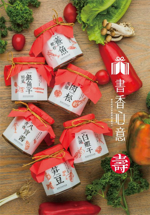 据书香酒店集团行政总厨潘小敏介绍,书香心意分为常规时令类和特色系列类两大体系。其中常规时令类根据苏州人的饮食特点,涵盖江鲜、湖鲜等春夏秋冬四季美食;特色系列类则分为福、寿、禧三类,其中“福”类包括;三件子、五件子、蹄髈等;“寿”类包括“三酱三油”——主厨八宝辣酱、豆瓣甜面酱、菌菇酱、书香秃黄油、蕈油、虾籽酱油、太湖白虾、银鱼干、肉松火腿、虾籽鲞鱼,笋豆等;“禧”类则包括芝麻核桃切片、核桃酥、袜底酥、蟹壳黄、枣泥拉糕、茶饼、方糕、青团子、肉月饼、书香粽子等。