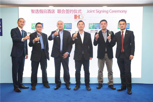 洲际酒店集团中国区智选假日酒店副总裁邱尤(左一)及大中华区智选假日酒店发展总监金璐翊(右一)代表智选假日酒店成功签约四个新酒店项目