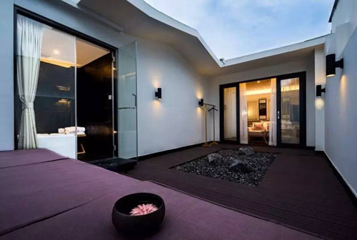 此外,五楼的露天庭院,设计师也别出心裁,将人文景观融入自然环境。庭院内的黑色碎石,来自阳台对面的阳朔山峰,可谓真正的将大自然的原始元素搬进室内。一眼望去,室内室外融为一体,满目景色怡然自得。整个庭院设计手法简洁明快,营造出意味深长的空悠禅意。