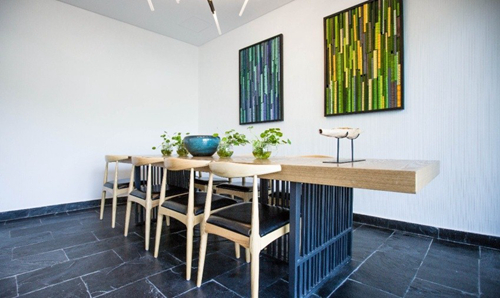 墙上的木制挂画与整个空间颜色相称,让人瞬间步入艺术空间。黑色石板地砖取材自当地石头,清清凉凉,让人心生安定之意。