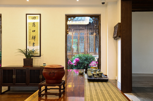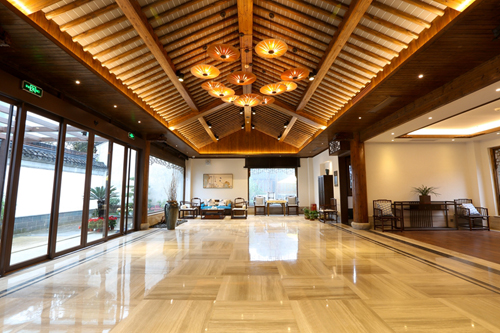 酒店大堂在设计上突出“雅致”主题,在装修材料上大面积使用了木头材质,屋顶直接露出砖瓦,配以一根根散发出老宅气息的木质横梁,大堂的立柱也用木材包裹。大堂摈弃了传统的豪华吊灯,以简单的筒灯和射灯为主光源,色调上以暖色调为主,让原本空旷冰冷的大堂变得温馨舒适,在江南的初冬时节透出一丝温暖。精心设置的楹联字画,书法体验区的文房四宝摆件,则让大堂透出一股浓浓的书香气息。迎客区的巨大原木茶桌,既可以展示书香酒店的茶文化,也可以让客人在办理入住时,品尝一杯暖暖的迎客茶。