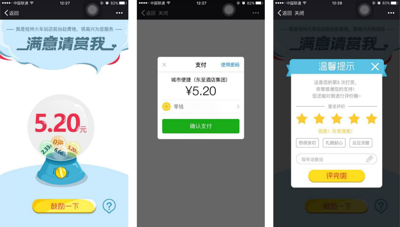 客人只需要简单地用手机扫二维码即可进行“小费打赏”,就能架起服务人员和顾客沟通的桥梁,不管是满意还是不满意都有一个渠道去表达,在有限的时间和空间内建立一种服务和被服务的关系,服务员变被动为主动,提升服务质量,并因此得到客人的尊重。