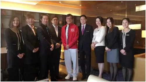 图为酒店总经理姚云青先生(右四)、市场销售总监汪雯女士(右三)、酒店业主财务副总监蒙道毅先生(左四)与成龙合影