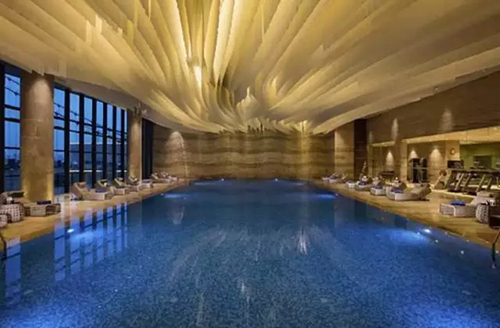酒店的泳池亦是带给人无限惊喜的,落地玻璃窗引入了自然光线,池顶的流线状装饰令人联想起百舸争流的船只前行留下的水波带。