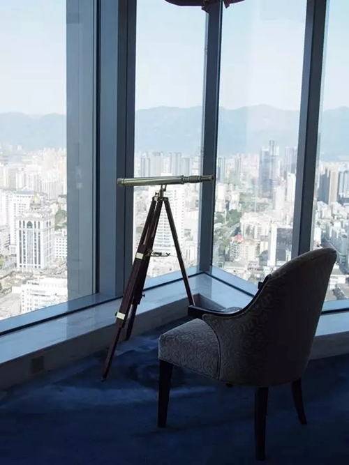 行政酒廊飘窗处配有一个望远镜,来宾可以借此一览福州的美景。