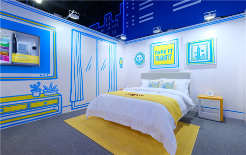 萌趣艺术装饰+酒店实物还原,虚实结合的场景独树一帜。走近7天展馆,就有两位萌趣卡通人物变身酒店前台跟大家say hi!手绘的萌趣画风贯穿整个展馆,从前台背景的“welcome”到客房墙壁的简笔窗帘,再到客房软凳边手绘的淋浴设施,鲜活有趣。