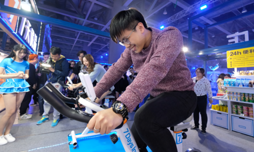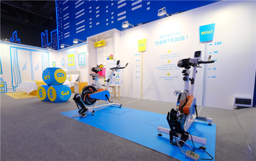 展馆里互动最嗨的动感单车,代表的是全新7天为顾客提供的 “年轻加油站”服务,它是设置在全新7天酒店大堂,专门为顾客提供简易健身器材免费借用的服务,供顾客在客房自由健身。