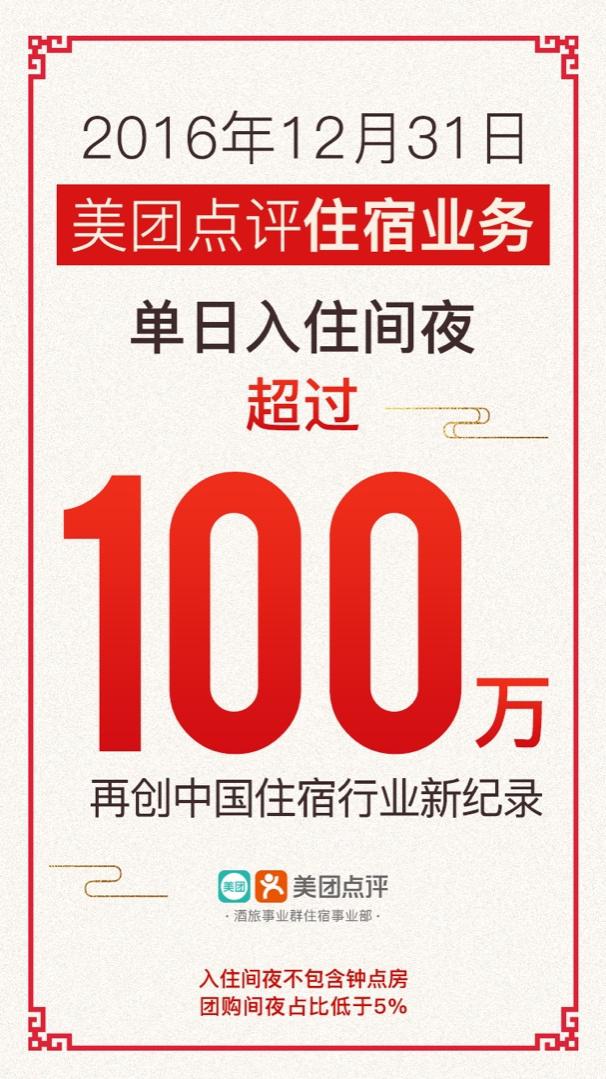 元旦假期刚过,美团点评住宿事业部便首发2017捷报:2016年12月31日,美团点评住宿业务单日入住间夜超过100万。