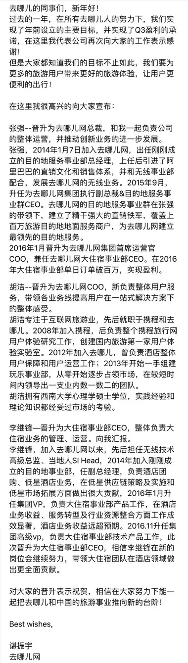 去哪儿CEO谌振宇发内部邮件:张强晋升为去哪儿总裁;胡洁晋升为去哪儿COO;李继锋晋升为大住宿事业部CEO。
