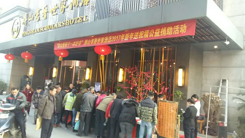 1月23日,柳州书香世家的总经理带领着员工们在酒店外的广场上发起了“给山里孩子一本好书”的送春联献爱心活动。活动邀请了当地书法名家们为广大市民书写春意浓浓、爱心满满的春联,同时酒店内的诗礼使者也在现场弹奏着一曲曲搞乐,吸引了众多的市民关注并参与到爱心捐赠活动中去,实实在在的为大山里的孩子们贡献着一份力量。