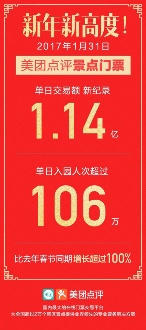 1月31日正月初四,仅景点门票单日交易额就突破1.14亿,当天入园超过106万人次,同比去年超过100%,再创在线旅游行业新纪录。