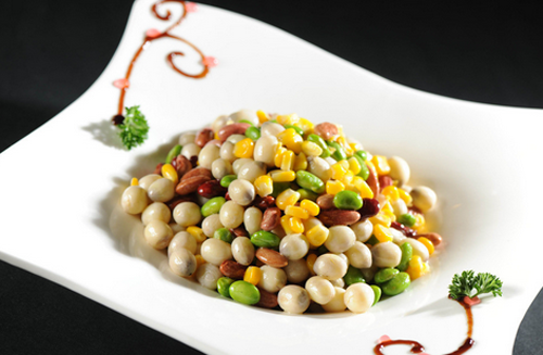 桌子上没有花,十二只冷盆就是十二朵鲜花,红黄蓝白,五彩缤纷。凤尾虾、南腿片、毛豆青椒、白斩鸡,这些菜的本身都是有颜色的。熏青鱼、五香牛肉、虾子鲞鱼等等颜色不太鲜艳,便用各色蔬果镶在周围,有鲜红的山楂,有碧绿的青梅。那虾子鲞鱼照理是不上酒席的,可是这种名贵的苏州特产已经多年不见,摆出来是很稀罕的。