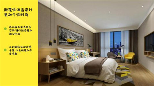 而榴莲小星酒店面对消费市场年轻化、个性化的趋势明显,锁定80、90甚至00后新型消费人群,推崇简约、时尚、个性。既然房子都根据自己的心情随意做出各种变化,为什么不将传统的客房家具也玩出新花样,随心所欲让它们“动”起来呢?所以客房内可移动的组合家具不仅具备与传统固定家具同等的功能,还可依照个性随性组合,尽最大可能去适应每个空间。移动的书桌、沙发、床头柜等,不仅满足个性多样的办公、休闲空间,让居住变得有趣、随性,同时搭配明黄色基调更能体现出年轻个性感。
