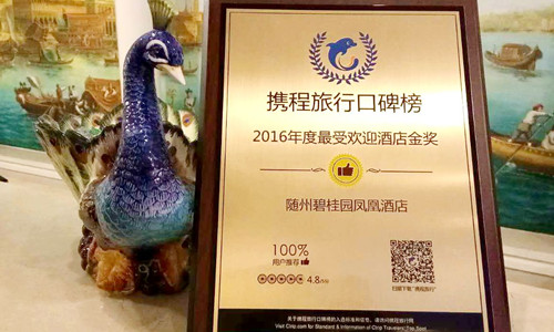 随州碧桂园凤凰酒店在携程旅行网网评得分4.9分及100%用户推荐,荣膺携程全球旅行口碑榜湖北区域“2016年度最受欢迎酒店金奖”。