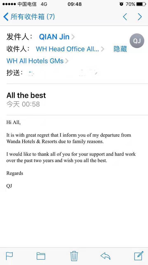3月17日凌晨,钱进已从万达酒店及度假村离职。在邮件中,钱进对这两年给予他支持和帮助的同仁们表示感谢。