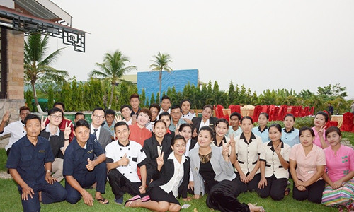 怡程·新伊亚酒店聘请的工作人员都是当地人(前右为总经理May Thet Htum)