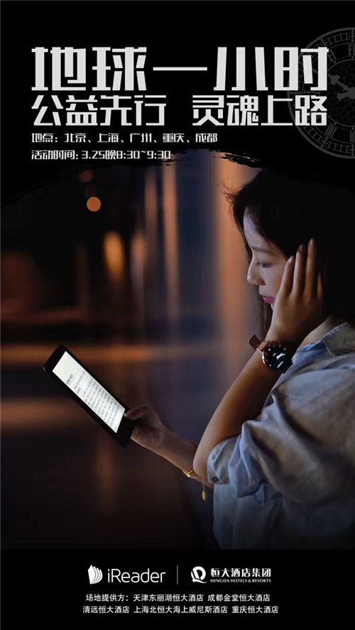 2017年3月25日,恒大酒店集团携手“掌阅iReader”电子书阅读器发起“地球一小时——公益先行,灵魂上路”为主题的单人极致沉浸式阅读体验活动,肩负起恒大酒店在降低能耗、节能减排方面的社会责任,希望号召大家在“地球一小时”关闭不必要的电子设备,节能环保之际,可以全身心的投入阅读的世界。