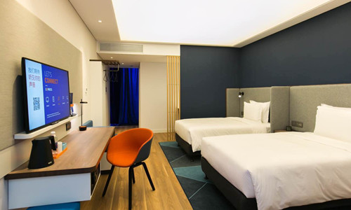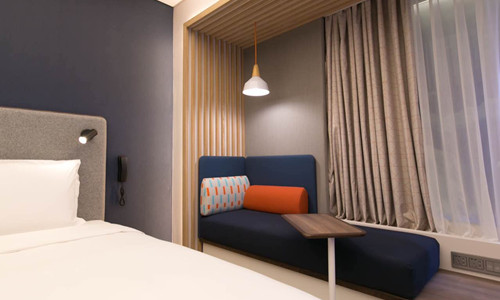 新设计通过白色、橙色和蓝色有机结合,让房间显得清新明亮、干净温暖,以及更富有现代感。高对比度的暖色调,能大胆地表达品牌个性,而蓝色纹理质感的墙面和橡木材料的组合,营造了一个温馨舒适的环境,让旅客能得到充分休息。另外,新客房还通过大面积白色的使用,营造出清新明亮、干净而充满活力的空间氛围。