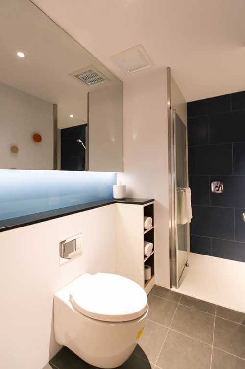 卫生间区域采用了开放式的设计,盥洗区独立于浴室区和厕所区之外。这一设计使得一位客人在淋浴或者使用厕所时,另一位客人仍可使用台盆梳洗,互不干扰。