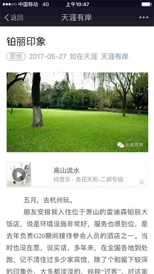 当我离开,带走了房间里那枚树叶状的书签纪念品,因为那句话,“喜欢我请把我带回家”。对我来说,喜欢的不只是这枚书签,而是铂丽给我的贴心服务。这次虽然时间短,酒店提供的很多免费设施没有去体验,但已经给我留下深刻的印象。我想,下次去杭州,我一定还会选择铂丽,重温这份宾至如归的亲切…