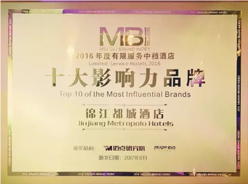 锦江都城酒店荣获迈点MBI“2016年度有限服务中档酒店十大影响力品牌”