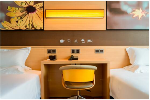 实际上,IU酒店的客房设计中就藏有大量为住客提供便利的设计,在贴合消费者喜好与习惯的同时也凸显了品牌自己的精巧构思。面对网虫与手机迷横行的现状,IU酒店特地在每间分店都铺设有720度无死角极速WIFI,让住客在店内的任意角落都可以享受到超快速网络。客房里的一体化办公桌上方安装了大量插座,其中还有USB插座,住客充电只需要插入设备的电源线/数据线,忘记带插头的小迷糊可就不用担心没法充电了。连房间里配备的座机也是IU酒店定制的“一键电话”,电话上只有唯一一个按钮,通过按钮住客动动手指就能马上找到前台工作人员,既减少了其他不必要的步骤,又能避免在休息期间被别有用心的陌生人打扰。