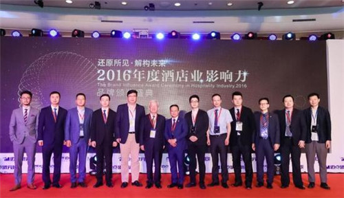“2016年度酒店业影响力品牌颁奖盛典”开幕剪彩合影,右六为铂涛集团副总裁、简约事业群品牌CEO洪伟先生