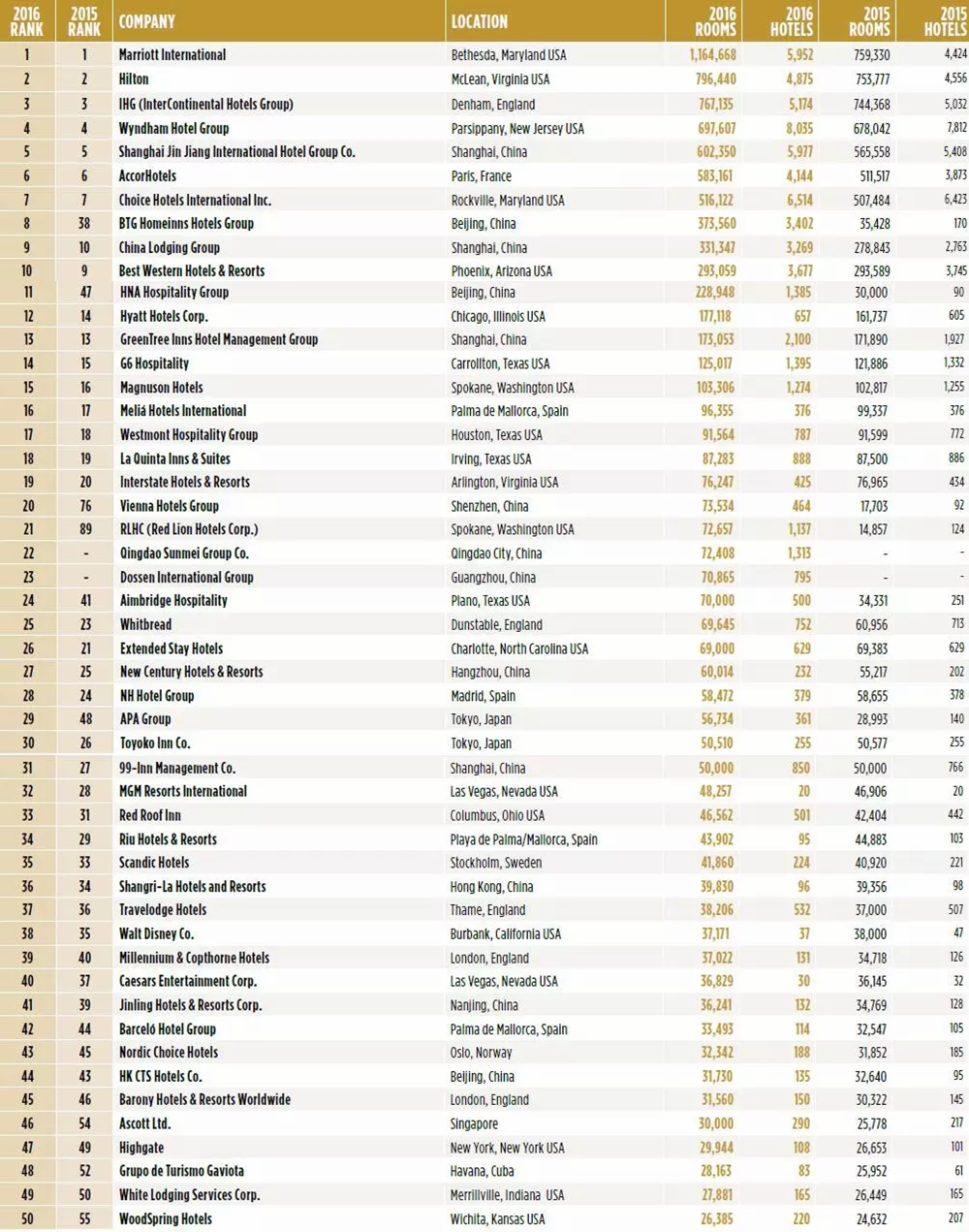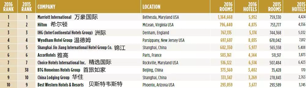 2016全球酒店集团300强出炉 中国有3家进入前十